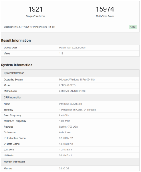 The upcoming Core i9-12900HX will have 16 cores in an 8 + 8 configuration, according to Geekbench. It will make its debut with Lenovo’s 82TD laptop, which is expected to be a powerhouse for gaming, rendering, and other demanding tasks.