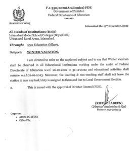 Winter vacations have been declared by the Federal Directorate of Education (FDE) for all model schools and colleges in Islamabad.