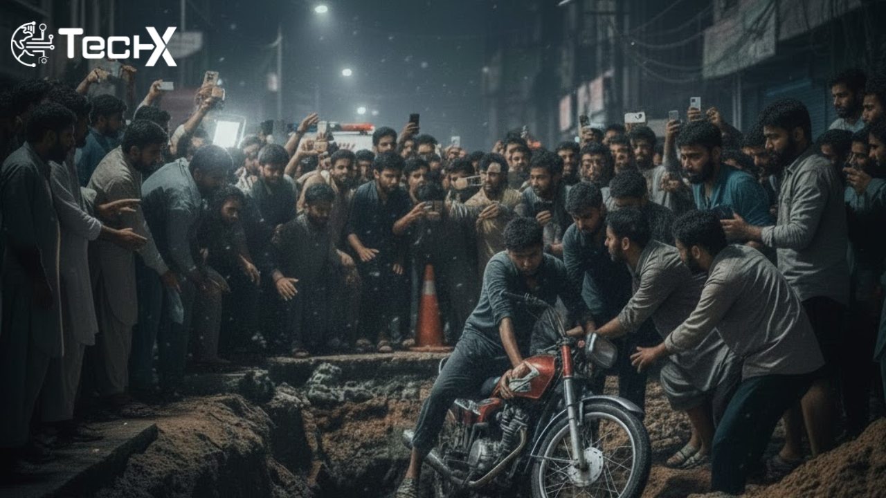 In Orangi Town, Karachi, a motorcyclist fell into a deep uncovered hole while riding with his bike, according to local videos and posts. The hole was part of ongoing construction or utility work and had no warning signs or protective barriers, making it extremely dangerous for commuters. Footage shared by residents shows the rider and bike falling together into the hole.