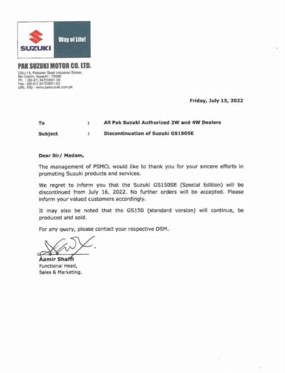 The GS150 SE has been officially retired in Pakistan by Pak Suzuki Motor Company (PSMC). The information was conveyed via a notification, which also made clear that the business would keep making and offering the standard GS150 model.
