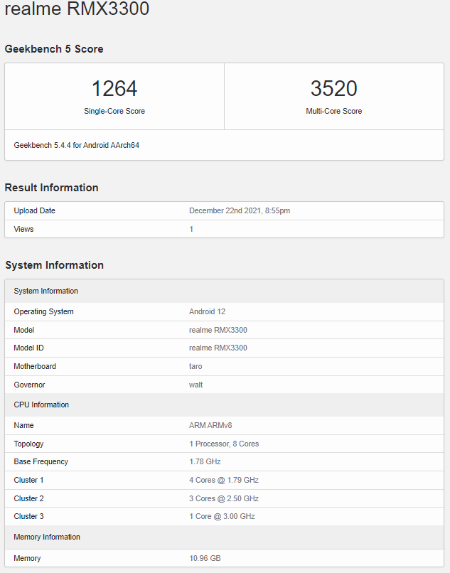 A Realme phone with model number RMX3300 has been spotted on the database, which belongs to the Realme GT 2 Pro. The listing confirms the device will pack 12GB RAM and will run on Android 12 out of the box on top of Realme UI 3.0. Further, the geekbench listing also confirms Qualcomm Snapdragon 8 Gen 1 SoC, which sports a clock speed of up to 3GHz and is built on a 4nm fabrication process. The chipset houses one core running at 3 GHz, three cores at 2.5 GHz, and four efficiency cores running at 1.79 GHz.