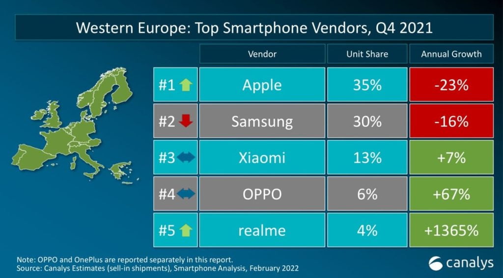 According to the latest Canalys data, realme’s market share was ranked among the TOP 5 in 30 markets and 6 regions globally in the fourth quarter of 2021, with the No. 1 spot in the Philippines and Bangladesh as well as a number of new TOP 5 entries including Germany, Peru, Colombia, and the Western Europe region.