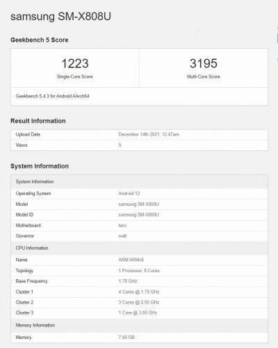 The Samsung SM-X808U has scored 1223 points in the single-core test of the Geekbench 5 benchmark. Whereas the multi-core score is 3195 points in the same test. The Geekbench listing also reveals that the upcoming Galaxy Tab S8+ will be equipped with an octa-core processor with a 1+3+4 core configuration and codename taro. This confirms that the Galaxy Tab S8+ will be equipped with Qualcomm Snapdragon 8 Gen 1 processor. To those unaware, the Snapdragon 8 Gen 1 is built on a 4nm fabrication process and comes equipped with an X2 prime core.