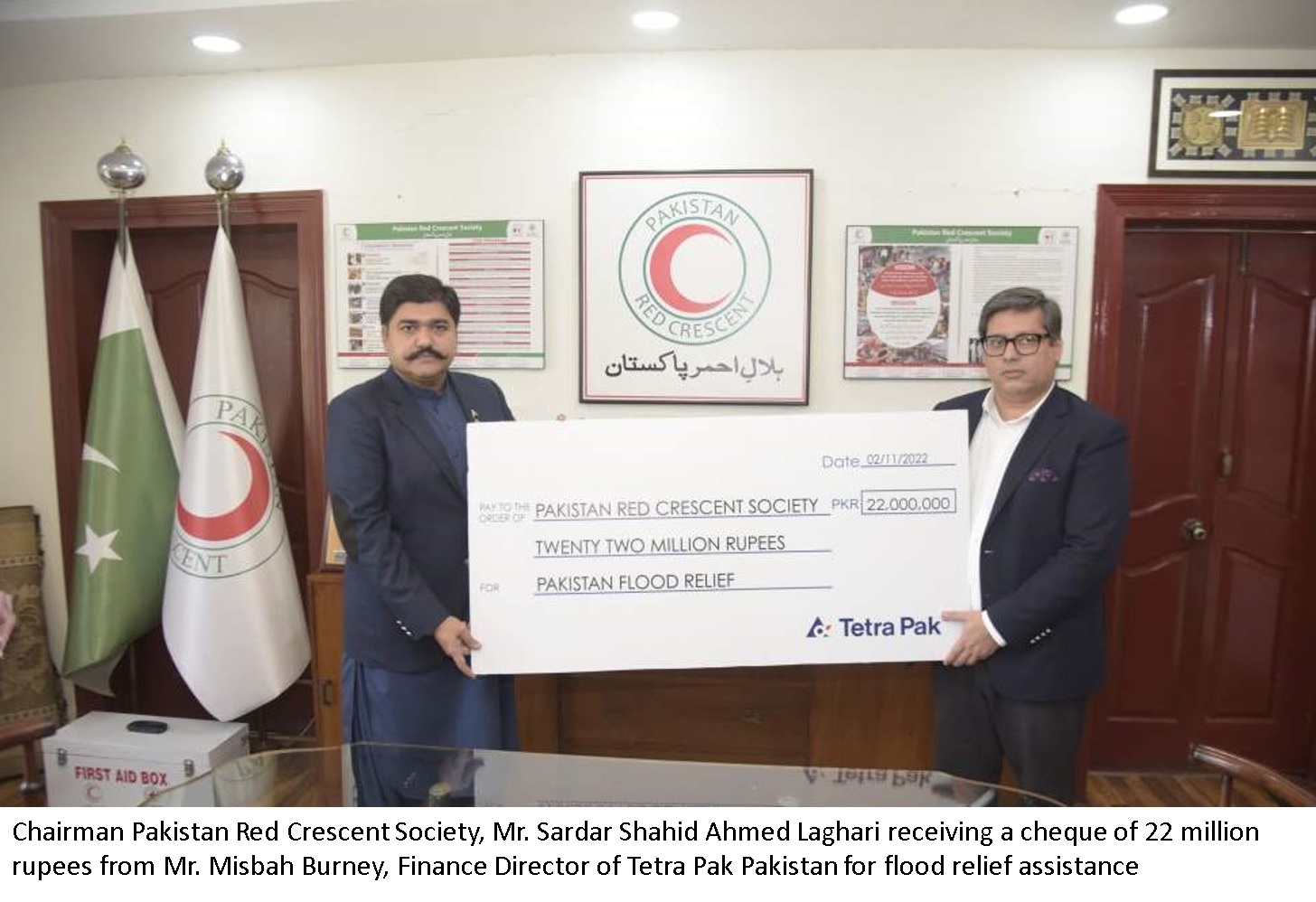 Tetra Pak Pakistan has also stepped forward to donate a generous sum of PKR 22 million to support the Pakistan Red Crescent Society (PRCS) in response to their emergency appeal to maximize flood relief efforts across the country to tackle the alarming situation. The donation cheque was presented by Mr. Misbah Burney, Finance Director of Tetra Pak Pakistan, to the Chairman of Pakistan Red Crescent Society, Mr. Sardar Shahid Ahmed Laghari at PRCS National Headquarters in Islamabad here on Wednesday.