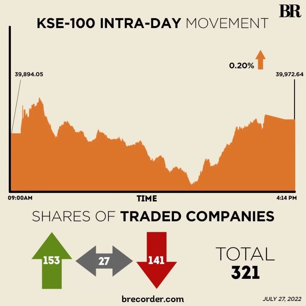 The KSE-100 ended the day at 39,972.64, closing with a little gain of 78.59 points, or 0.20 percent.
