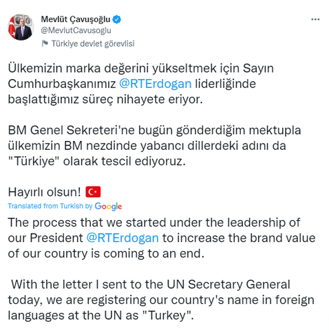 “With the letter I sent to the UN Secretary General today, we are registering our country’s name in foreign languages at the UN as ‘Turkiye,’” he wrote, including an umlaut over the “u”.