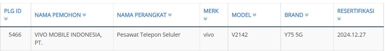 Vivo Y75 5G Indonesia Telecom Certification
